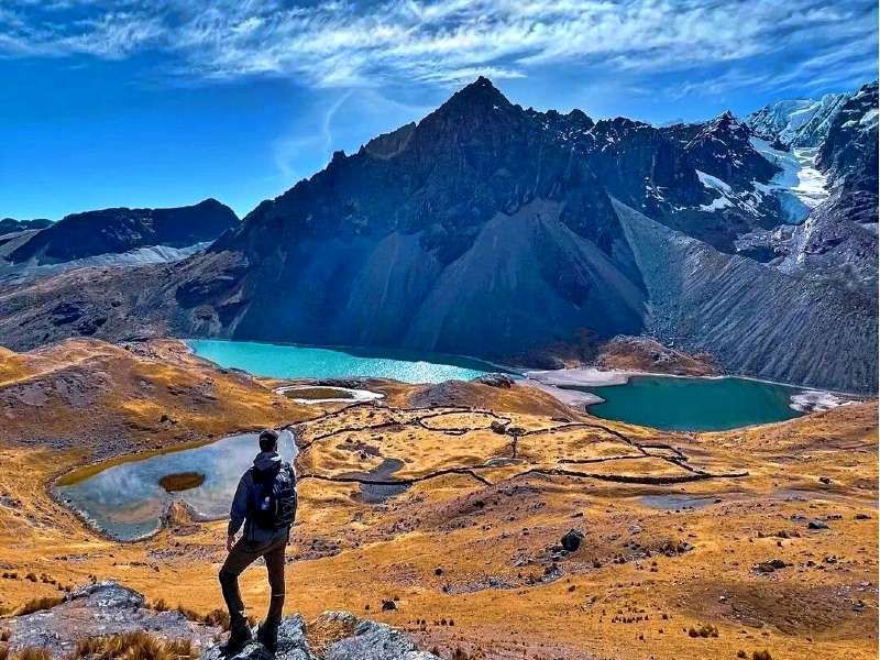 El promedio de caminata es de 5 horas ida y vuelta, durante el recorrido apreciaremos las lagunas de Azulcocha, Otorongo, Pucacocha, Alqacocha y Q’omercocha, así mismo, apreciaremos los picos que rodean este magnífico escenario como son el Ausangate (6384 m), el Mariposa (5842 m), el Jampa (5500 m), el Pucapunta (5740 m), el Caracol (5625 m) entre otros nevados que son los más altos del Cusco. La dificultad de esta caminata está más por el tema de la altura, ya que dificulta la respiración y por su ubicación geográfica el clima es cambiante por lo que tendremos que estar protegidos con gorros, bloqueador solar, ropa abrigadora y los más importante un buen calzado de trekking, pero tranquilo cada persona anda a su ritmo, respira profundo y con calma continua el paso. Después de recorrer aproximadamente 15 km podremos descansar y tomar un merecido almuerzo. Lo recomendable después de esta caminata es zambullirse en las aguas termales que son un remedio increíble para descansar y relajar los músculos.